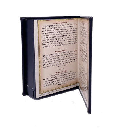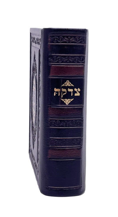 This beautiful leather tzedakah box has a flap on the cover featuring various tefillos such as: